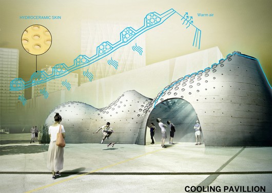 IaaC Students Develop a Passive Cooling System from Hydrogel and Ceramic A proposal for a "cooling pavilion" designed with a hydroceramic skin. Image Courtesy of IAAC Institute for Advanced Architecture of Catalonia