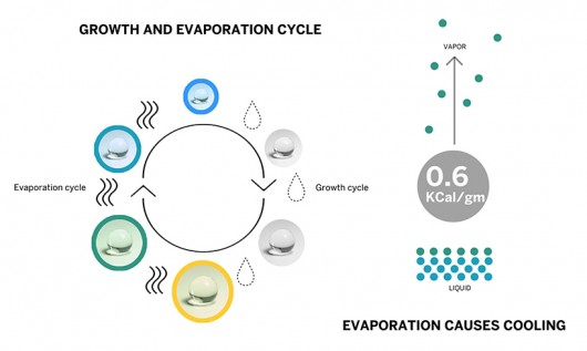 Hydroceramic works due to the cooling effect provided by evaporating water. By absorbing large quantities of water, the hydrogel pellets that are spread throughout the composite material expose a large surface area for evaporation to occur, which both decreases the temperature and increases the humidity of the surrounding air. In turn, the material is therefore responsive: the cooling effect is greatest when the surrounding environment is warm, but when the surrounding is cool little evaporation occurs.