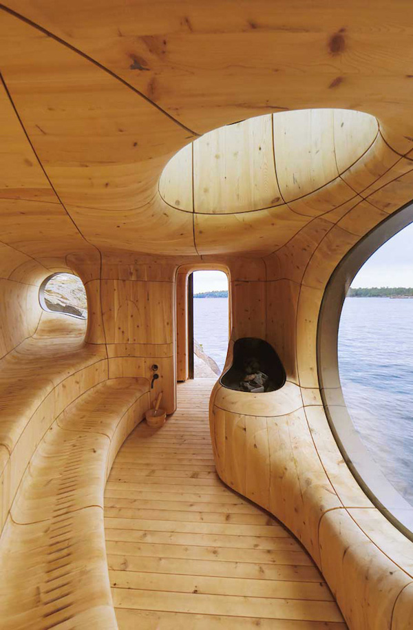 Toronto architectural firm PARTISANS has conceived of and created a freestanding sauna on a private Canadian island that takes its inspiration from the undulating form of a grotto. Grotto Sauna, built on a prehistoric rock formation, straddles the line between sculpture and architecture, appearing to be a simple rectilinear volume on the outside, but masking an exquisite set of curves on the inside. “Challenging the standards of current practices in the construction industry, we worked directly with a millwork and steel fabrication partner on every detail. Together, we developed a new process of fabrication; utilizing state of the art 3-D technology to scan, model and build the Grotto,” explain the designers. Hot stuff, say we.