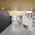 The architectural concept consists in removing the floor currently separating the two levels to create a wide-open space in which two large boxes appear to float in mid-air. These suspended boxes, adorned with unfinished plywood panels, each contain a bedroom and a bathroom.