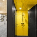 This configuration creates three gaps, each being two floors high; the centre gap becomes a physical exercise room with a pair of gymnastics rings. The whole structure is connected lengthwise by a block that is painted black; the block accommodates different services, including stairways, a shower room and part of the kitchen.