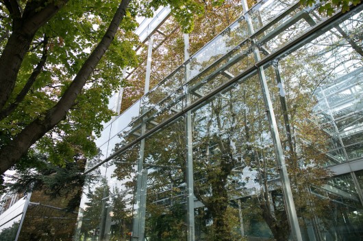 There are also situations where you can play with the presence of nature to the point that you wonder if it’s really a garden, for example. A garden is where thousands of natural species have reproduced and are coexisting together. All of these things, as well as the interference with the sun and the rain, create certain sensations that we aren’t used to feeling. It’s a form of simplicity that truly hides an enormous complexity and this complexity is what distinguishes that specific location. The reflections and the porosity of the emerald-colored glass make it so that you can hardly see what’s behind. When you put blinds on the inside, it appears as if the landscape is printed on them.