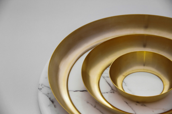 Moreover, the jewelry-inspired pieces allow each user to outline their personal eating space. The concept of personal space is highlighted by maintaining an outer edge on the plate, and the use of precious materials such as marble, stainless steel gold plate, and copper.