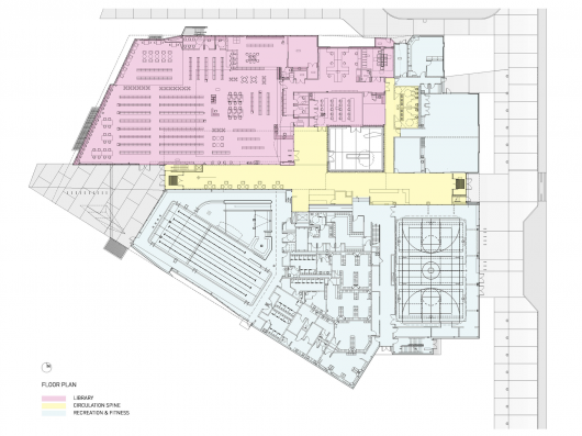From the architect. This mixed-use Library and Community Recreational facility posed the challenge of bringing together two diverse programs – and the needs of two diverse clients – to create an enhanced community experience. The desire was to create a single integrated facility in which the program elements interact and elevate each other through a series of strategic architectural gestures.