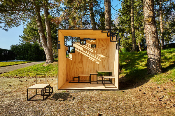 It’s partly closed with pine walls, floor, and ceiling, but with moments of openness highlighted by steel cubes. The cubes become places to sit or tables to highlight objects. Modular seats are both inside and outside the cube.