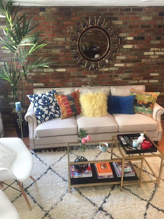 My gorgeous townhouse apartment is located in Cambridge, Masschusetts just a few blocks from Harvard Yard. What really sold me on this place was the exposed brick. I’m a sucker for character and three large walls gave me just that. It’s a fairly large apartment as it has a full living room, eat in kitchen, small laundry room, 2 bedrooms and 2.5 baths. Plus when the snow melts, I have great outdoor space.