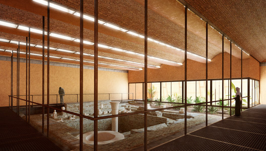 Kéré Architecture’s proposal for a protective shelter preserves and celebrates the heritage of the site. Using local clay and stone, the shelter offers a contemporary yet humble design. A 60 centimeter thick mud brick wall protects against natural eroding forces outside, and maintains a stable interior climate. Natural ventilation and humidity control is promoted with the use of vaulted brick ceilings and courtyards, helping preserve artifacts.