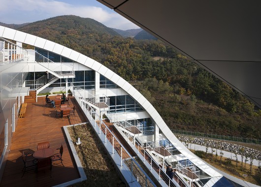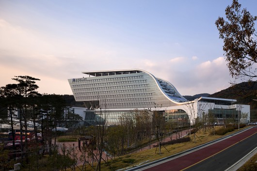 From the architect. As one of the most prominent corporations in Daegu, the Korea Gas Corporation headquarters building was designed with the concept of ‘ECO VESSEL’, projecting a clean & efficient image. Considering the project location with 3 hills surrounding the site, the building was designed with low-profiles to harmonize with the surrounding nature.