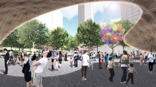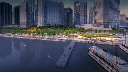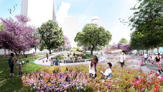 “KPMB Architects + West 8 + Greenberg Consultants’ proposal successfully created a signature waterfront park and iconic ferry terminal that complements proximity to the water’s edge while offering spectacular views of the lake. The jury agreed that the winning proposal’s heavily planted and lush green space set it apart from the other designs and would help support the large number of visitors during peak times.”