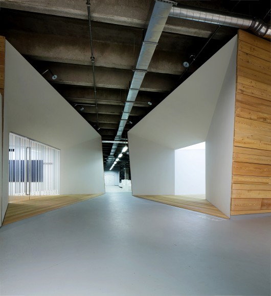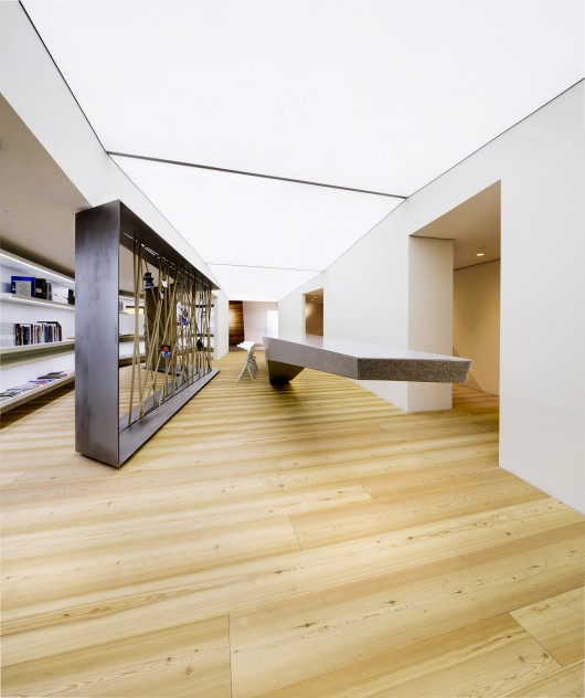 The walls and the ceiling, with its white surface painting, form an ideal background for creative thinking. The office area is some 132 m² in size. Besides a wall-integrated hanging storage system made of steel for mood boards there is a computerized workstation. In addition, a multimedia system consisting of projector, monitor and acoustic system have been installed. The sound quality is regulated through a specially designed ceiling. The inner life of the three structures, like a laboratory, stands out in bright white paint.