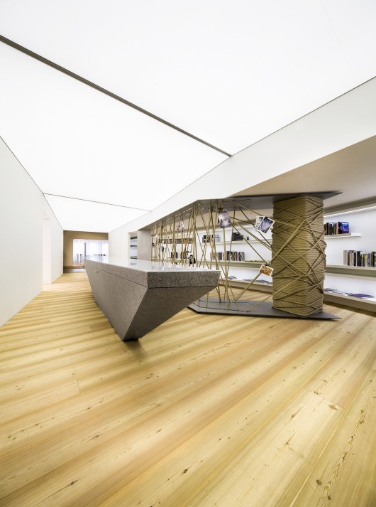 The ID:pool is located in the centre of the creativity design area, which also accommodates a comprehensive collection of distinctive materials and serves as inspiration while planning new products. The open construction is divided into three different areas. In the centre, the main hall is equipped with the standing table ‘Folding 888′ and a lumen ceiling divided into three sections. This approach focuses attention to the hall as being the centre of the lab. Filtered by the reticle, the eastern section is complemented by the bookshelf. By deploying the reticle, daily actual news and recent trends can be sorted and displayed. Behind the dividing wall, there is a kitchen with a lounge area.