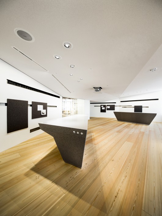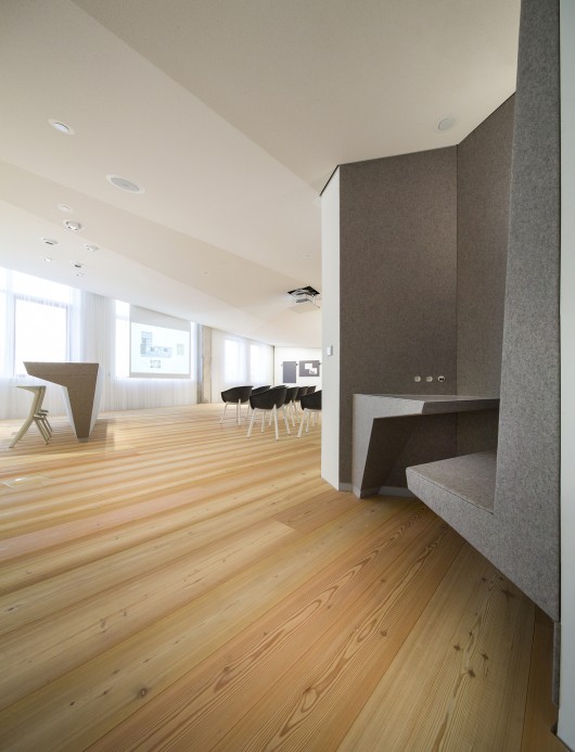 The wooden panel covering the outer walls is reflected by the parquet floor of the labs, the entryways, in the form of cones, intensify the attractiveness of the inner area. Significant by design are the felt-covered sideboards and tables that structure the room and promote the exchange of information among personnel. In addition, the staff can focus on their work in separate working niches.