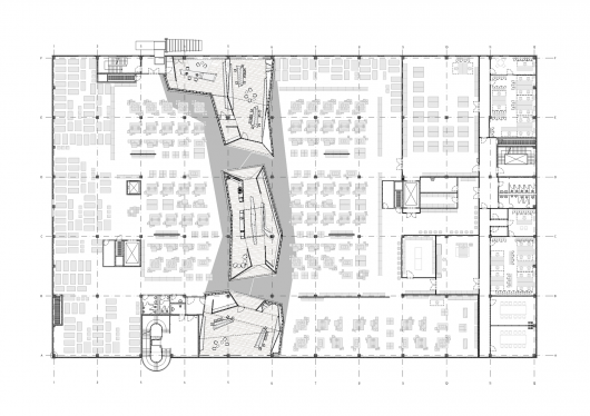 “We intended to counteract the optical appearance of the headquarters, characterized by steel and concrete, by using lively and cosy material in oder to match the functional skeleton construction made of reinforced concrete with modern and individualistic design elements”, commented Ralf Böckle, owner of schöne räume, the design approach. By following this idea, three volume structures are to form an ensemble within the central axis of the 2nd floor. The structures divide the total area of 3,250 m² into two design areas and comprise two creative labs at the northern and southern end, respectively, as well as an ID:pool in the centre. The outer wall of the creative labs were covered by pure wooden boards that form a relief due to the distinctive thickness of the boards.
