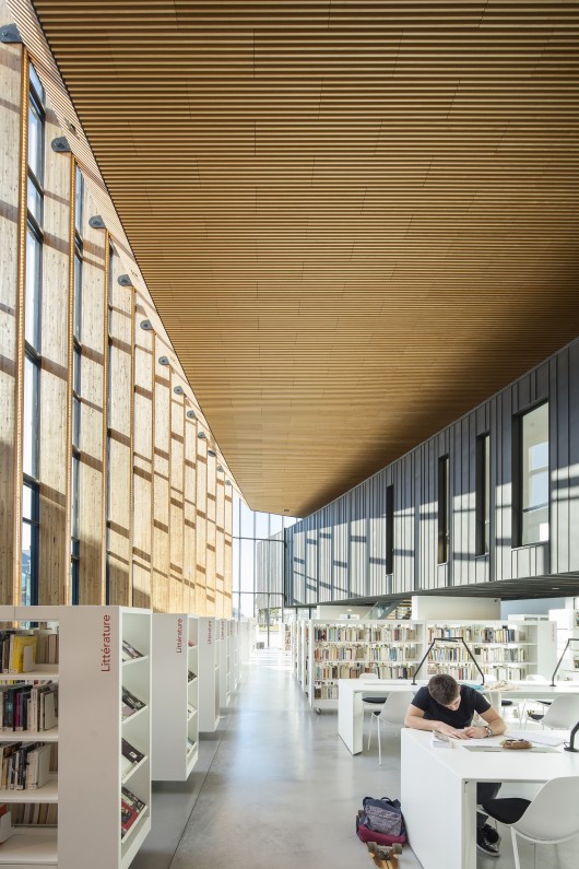 The contents of the two cultural parts of the program unfold and intertwine in an inverted rising movement, mirroring Saint-Malo’s main artery: the curve of the media library rises towards the sea, and the mezzanine art-house cinema towards the inland areas. La Grande Passerelle links the station to the old town and the newer areas around it. Its main façades, located along the main artery, let in the light and the views: culture is diffused into the town.