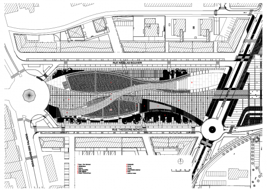 Taken as a whole, La Grande Passerelle expresses the metaphor of openness, a gesture inspired by the proximity of the seashore and the wish of Architecture-Studio to establish a continuity between the built structures and the geometry of the exterior areas. Around this spatial separation there are also the generous public spaces, laid out in two esplanades on both sides of the building, with a small outdoor amphitheatre added to the south.