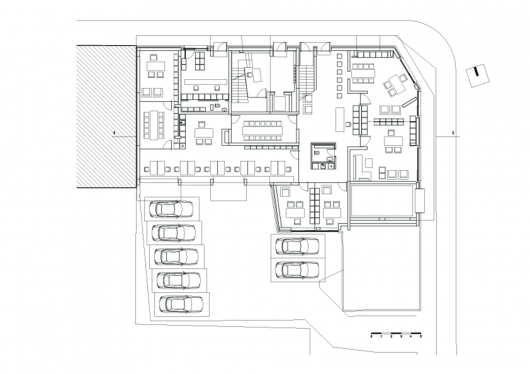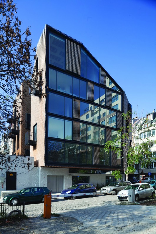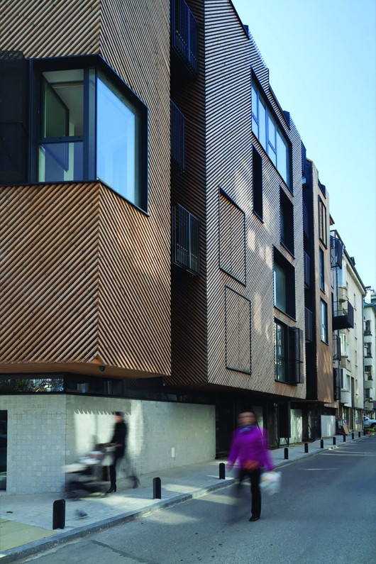 Seen from the street the building gives an impression of a row of houses, each coated with wooden lamellas, varying in size and direction. The ground floor, covered in the same stone as the surrounding pavement, is separated from the four wooden volumes by a glass stripe. It gives the sense of the volumes levitating above the stone, effect which is most evident at night when the stripe emits light.