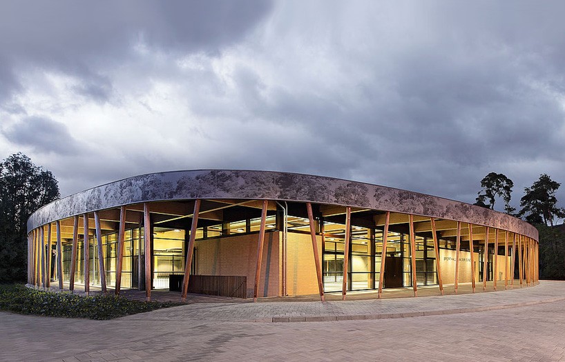 the design reinterprets the notion of a educational village with a large canopy enclosing the brick building below.