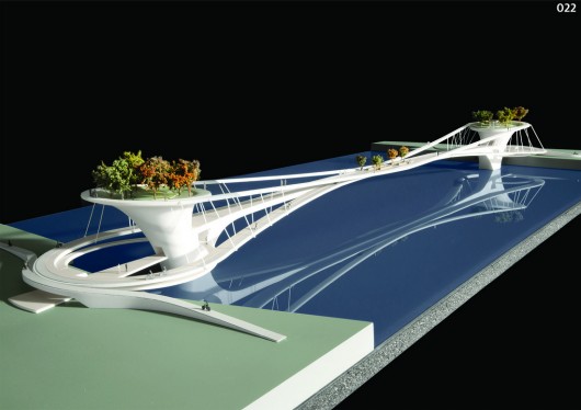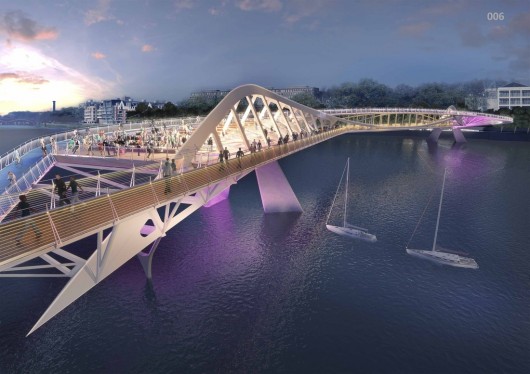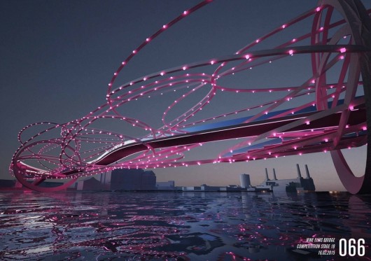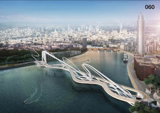 The recent unveiling of the 74 entries to the Nine Elms to Pimlico Bridge competition was undoubtedly intended to cause a media circus, hoping to emulate the furore that surrounded the much larger Helsinki Guggenheim competition when they released all 1,715 of their entries to the web in October of last year. The competition, which asked designers to propose “one of the most expressive and visible landmarks in London,” is the latest in a series of dramatic changes taking place on this stretch of the South Bank of the Thames. This new community, one of London’s most prestigious new neighbourhoods, includes Keiran Timberlake’s new US Embassy and a slew of residential developments, culminating in the highly-touted renovation of Battersea Power Station, complete with accompanying buildings by Foster + Partners and Frank Gehry, and a public space by BIG.
