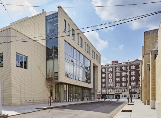 Clad in ivory terra-cotta, the studio wing houses the studio arts, with large north facing windows and curtainwall. The new architecture is informed by the church’s massing, scale and detail, and its facade elements harmonize with the neighborhood’s brick and clapboard context. The transparent ground floor gallery adds vibrancy to the streetscape.