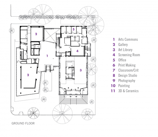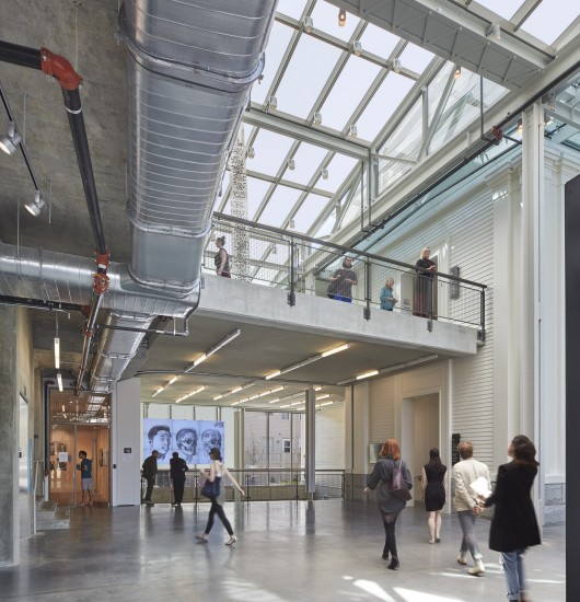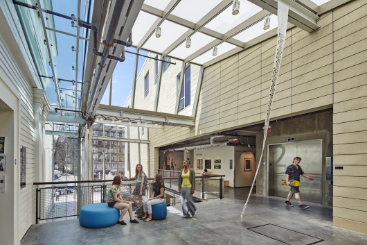 The two wings are connected on the upper floors by a highly-detailed, glass-enclosed commons that includes the main entrance. The saw-tooth form of the connector recalls the industrial buildings so often inhabited by artists and unites the two wings. The program mirrors this link and radiates around this “Arts Commons.” The commons creates opportunities for interdisciplinary connection across artistic mediums, combining studio arts such as painting, drawing, ceramics, graphic design, illustration, printmaking, and sculpture with new media, animation, digital arts, and photography.