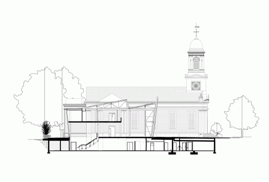The Center links a historic c.1845 church with a new terra-cotta structure, creating dialogue between nineteenth- and twenty-first century architecture. Exterior materials come from a single palette that responds to its context: glass, terra-cotta, painted clapboard, concrete, steel, copper, and granite.