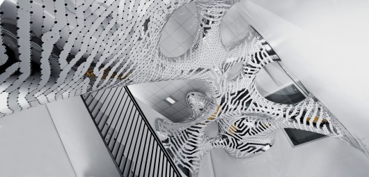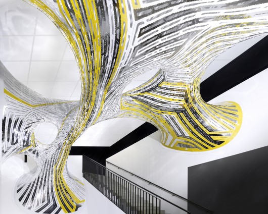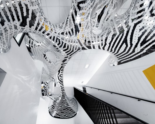 Marc Fornes / THEVERYMANY has realized two permanent installations – “Under Stress” and “Sous Tension” – in the public areas of the Department of Computer Science at the French Institute for Research in Computer Science and Automation (INRIA). Both structures “utilize programming techniques inherent in computer science to optimize the form and creating a pattern on the surface.”