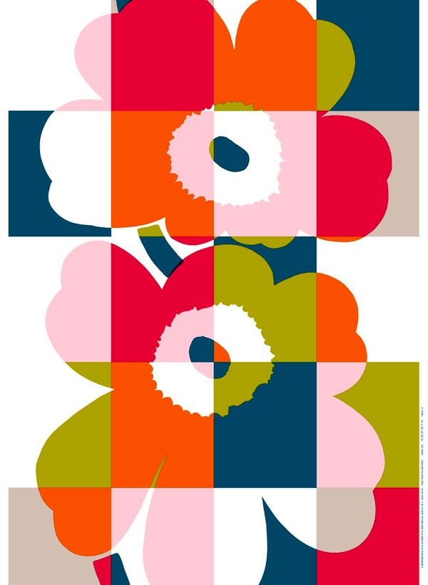 Ruutu-Unikko, which translates as ‘big square poppy,’ is a new iteration by Maija Isola’s granddaughter Emma, and ups the ante considerably with an oversized graphic featuring a pair of Unikko poppies emerging from a grid-based arrangement. Marimekko is making the new poppy print available in either a vivid multicolored scheme or dramatic black-and-white.