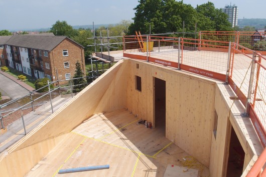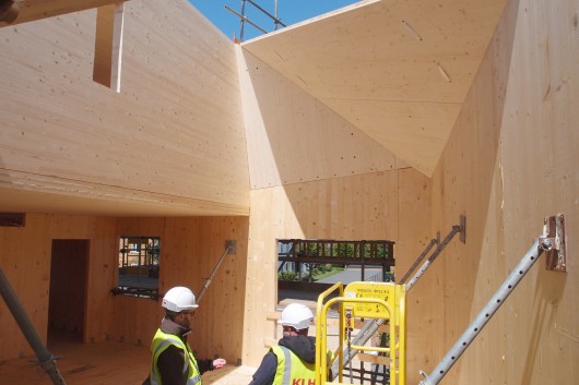 The walls, floors and roof of the building were built from cross-laminated timber (CLT) panels. Unlike most other forms of construction these form a continuous shell that can easily be made air tight to eliminate drafts. This shell can in turn support a continuous layer of insulation without penetrations of other building elements that would create a cold bridge.