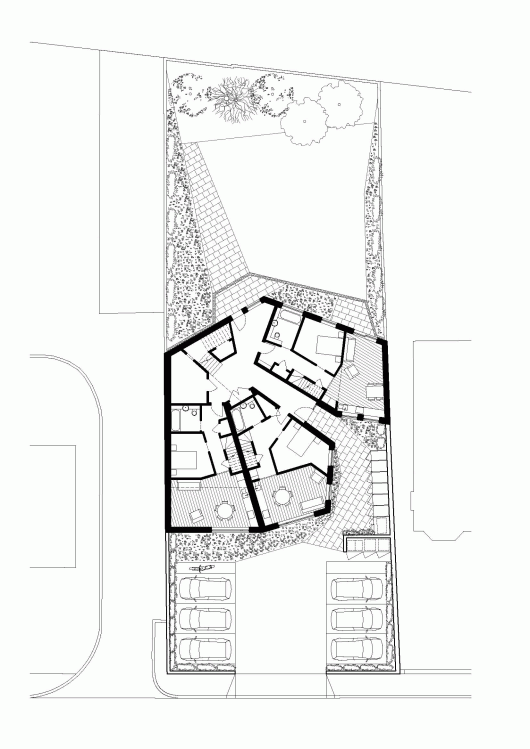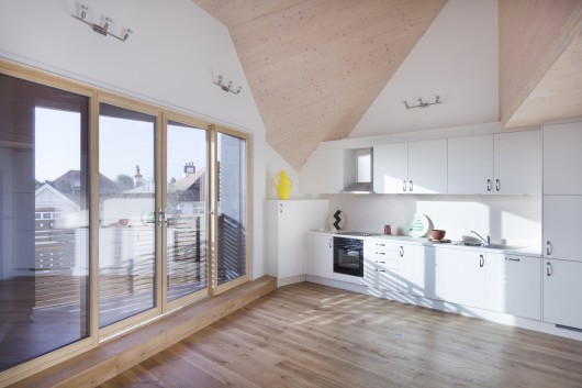 To optimise the available space, light and views a non-orthogonal geometry was used in the design. Without the restriction of designing only in right angles the building could respond much more sensitively to its constraints. All 6 flats achieved south-facing, double-height living spaces and generous balconies.