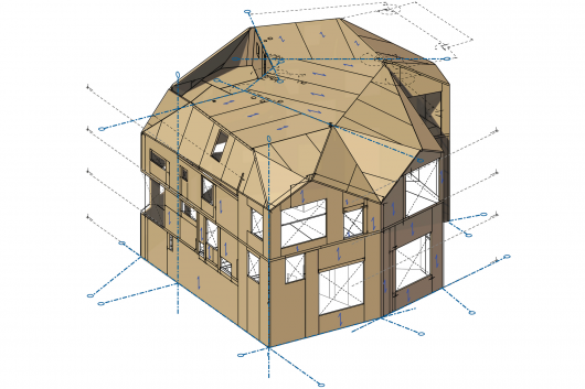 The non-orthogonal design was made possible by the cross-laminated timber (CLT) construction system. The CLT panels were cut by computer numerical control (CNC) directly from a 3D computer model. This digital fabrication workflow allowed the many complex angles to be easily constructed on site from a precise kit of parts.