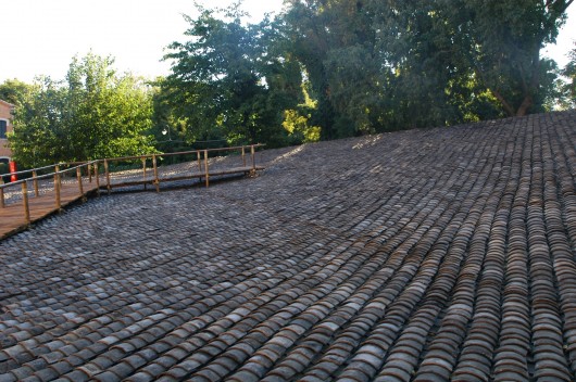 In other projects, tiles represent an opportunity to create a kind of artificially built landscape. Their Tiled Garden installation for the 2006 Venice Biennale is an extreme example of this very idea, wherein a sea of tens of thousands of recycled tiles from the local area were carefully laid in rows and accessed by pedestrian bamboo bridges. A similar concept is revisited in the Wa Shan Guesthouse and combined with the wa pian qiang wall featuring rows of recycled tiles. Just as in the Tiled Garden, the roof of the Wa Shan Guesthose is made accessible through a series of pedestrian bridges and stairways over the landscape of the roof. Here the undulating peaks and valleys of the tile roof mimic the topography of the surrounding landscape and form a meditative environment on the roof of the primary structure.