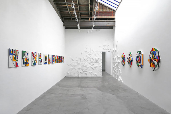 The exhibition is made up of five parts, each having their own concept and look. There is a four piece series of purely symmetrical, colorful compositions, a series of 12 square works that reflect Moore’s signature graphic skills but in 3D, a series of greyscale cut-paper mosaics that led to this new way of working, an extra large construct made up of five, colorless pieces that explore light and shadow, and finally a large mosaic, white-on-white mural composed of the same shapes used in the rest of the work.