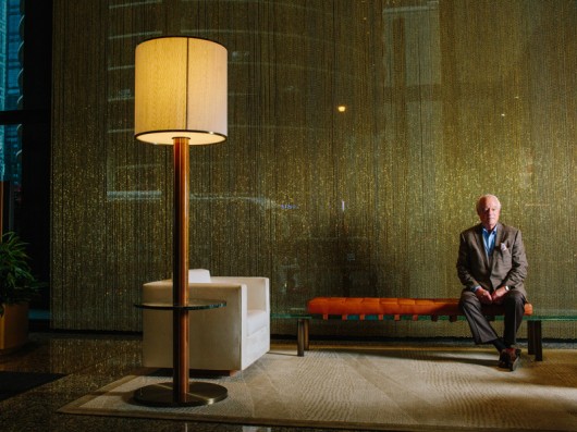 “This is my bling,” he says of a tall, bronze-beaded curtain, which brings restrained glamour to the warm but understated entrance lobby below us. Here, Lohan was called in to form a bridge between uncompromising floor-to-ceiling, plate-glass windows and the opulence of the hotel above. Lohan, who worked on the building with van der Rohe when it was commissioned nearly 50 years ago by IBM, was called back in by new owners to adapt the lobby to its new use as a house of luxury.