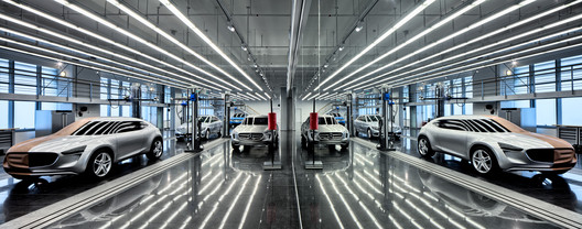 “Although the design center itself plays the most important role in the Mercedes-Benz advanced design center it only represents 20% of the space for the project. Besides several floors for office and labs we had to integrate a large scale workshop for mechanical testing as well an open courtyard for presenting designed cars within a natural environment.