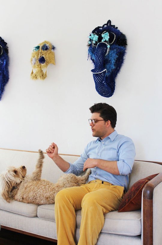 Michael’s house tour brought about a few firsts. While I was photographing his kitchen, he requested that I shoot his garbage can (huh?!). Afterwards, when he explained that it is from the 1920s and was used in a hospital, I was convinced that it indeed deserved a closeup. Seeing a piece of a meteoroid up close and personal was also a first for me, as was the use of crocheted masks as decor. It all works!