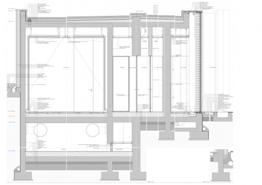 Constructively the building consists of a reinforced concrete structure externally clad in schist pillars of Foz-Coa. Structural interior walls are made of concrete and partitions are made of brick masonry; on this system are set up the final finishes. The roof is coated with a layer of schist cobble.