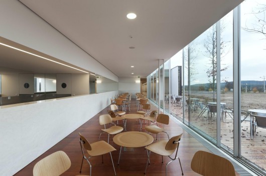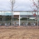 The building is implanted south of old fair grounds and has two entrances, public (east) and services (west), set by the mismatch of the walls. There is also a direct entrance to the cafeteria (west), through a large glass door, allowing an independent program.