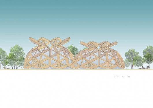 The structure is composed of a big three-dimensional grid that gradually transforms in woven branches, as it grows to the open top of the dome. The structural elements become architectural ones, designing both the internal and the external facades as tree branches; the empty spots of the grid enhance air and light permeability, together with visual continuity between outside and inside.
