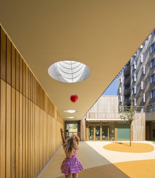 Thus, the distancing of the internal facades of the apartments by a system of canopies creating a covered area protects the children and provides an intermediate space, a natural extension of the activity rooms towards the outside.
