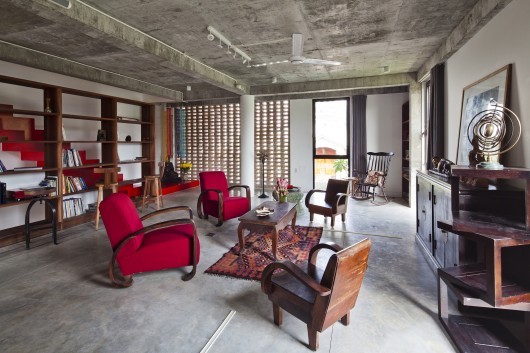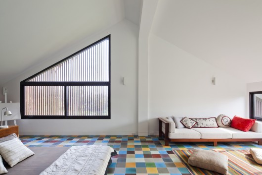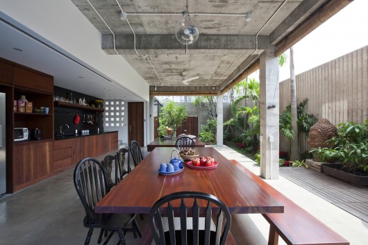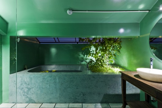 Attic space is converted into a large bedroom. Openness is also the main concept here with large sliding windows and an open air bathroom. Direct sun light is filtered through a timber screen and vegetation in built-in large planters.