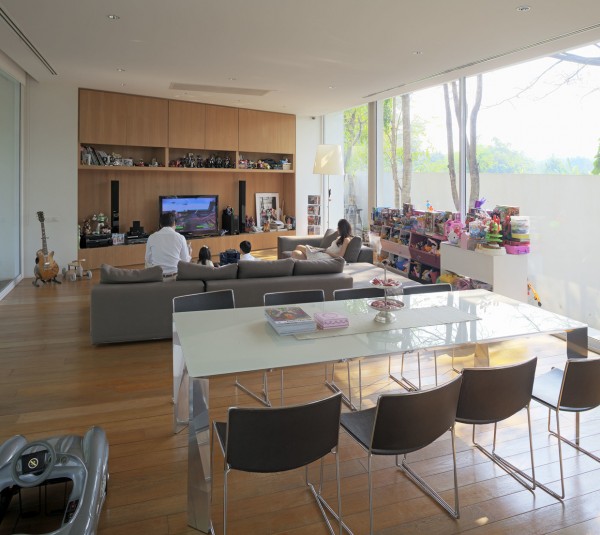 The first space as the floor-to-ceiling windows and low, clean profile that is indicative of a stylish modern home. The wood elements in this house are particularly notable with rich lacquered wood covering floors and walls. The outdoor carport is also quite stylish, emphasizing the fluid life of a Thai family that merges the indoor and outdoor easily and almost without thought.