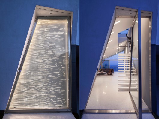 A grand entry door made of a stainless steel tube frame marks the threshold into the relatively small house. The 10′ high door makes use of a hydraulic pivot and a concealed magnetic locking device.