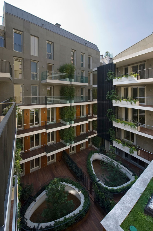 The surprise that one can experience when opening the door of a historic Milanese building, is confirmed in this prestigious building at Viale Montegrappa, whose court is divided horizontally by a suspended garden that separates the commercial ground floor, from the residential area. The residential part develops vertically in different buildings with different heights, from four to six floors above the court. The continuity between the two levels, commercial and residential, is given by two trees that pierce, with two large elliptical eyes, the suspended terrace cover overlooked by 25 apartments of different sizes and shapes.