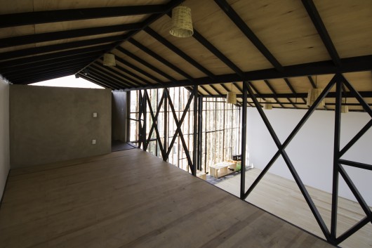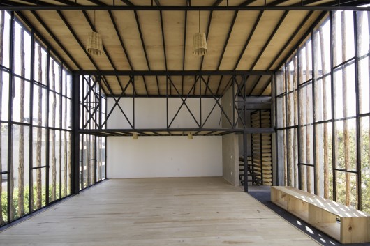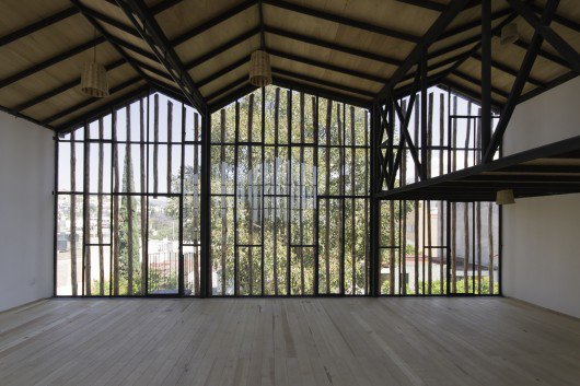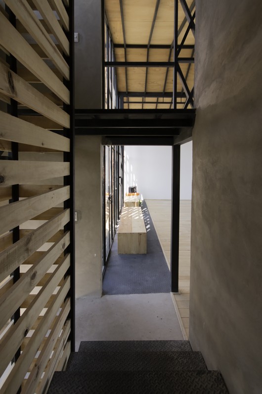 Behind the andirons, the building, in a raw gray finish, opens large windows into the street on the first two floors and culminates on the third floor where a metal structure stands creating the yoga room. Here, the space surrounded by metal windows is protected by metal andirons, and opens to the north and south landscape.