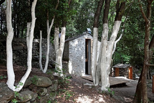 A micro-hydro turbine provides electricity for the site. Built to reach energetical self-sufficiency, the construction is made of local Laricio pine, sweet chestnut tree, and indigenous stone from the site.