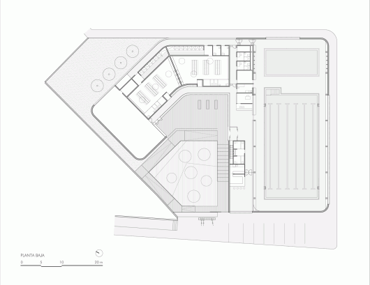 It is C-shaped, with a landscaped public plaza within. So the pool enclosure volume rests longitudinally on the new street perpendicular to Andalucía Avenue, allowing natural light from the southeast. As the volume is located at the top, it allows a basement underneath for technical facilities with direct access from the avenue (lower bound of plot).