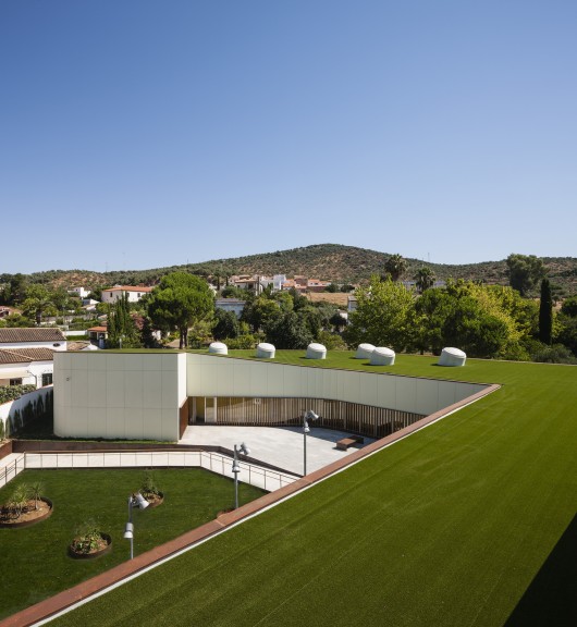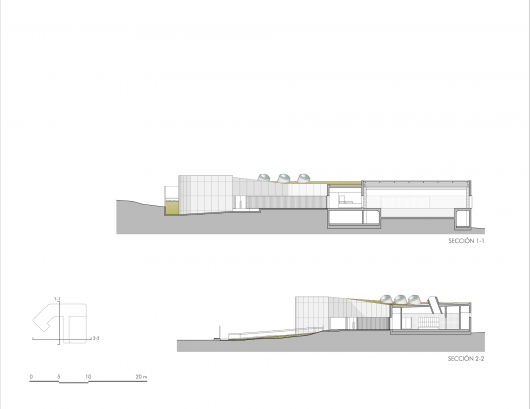 The facade consists of a single skin envelope made of vertical cement-bonded boards in a light colored, which emphasizes our idea of a folded building around the unforgettable image of the existing gardens. The design of the green roof has been necessarily taken care of, since it is as exposed as the rest of the facades due to the topography (the land rises sharply to the northeast, to a nearby hill, which makes it very visible); it thereby assumes a leading role at a landscape level in the vicinity of the environment.