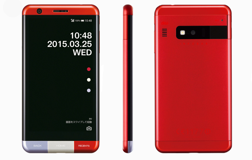 the au by KDDI ‘INFOBAR A03’ smartphone, created by japanese product designer, naoto fukasawa, includes tricolored, simple usability, touch sensor keys.
