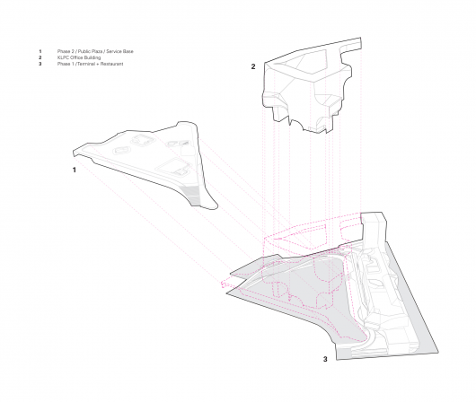 At ground level, a boardwalk and public plaza weave through the site’s footprint, encouraging pedestrian traffic and providing a logic for interior circulation. A triangular plan is bordered by roads for taxis and other automobile transit, and intercut with green areas. The project also features ample parking facilities, with spaces for 1500 cars and scooters.