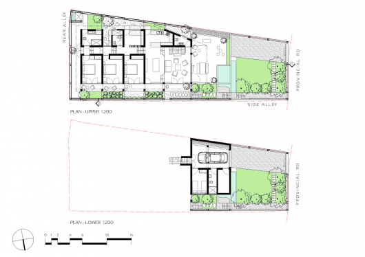 Passive design features were critical to reducing the carbon and energy footprint. The effectiveness of natural ventilation, capturing breezes, cooling perimeter gardens, high ceilings, ground level living, and thermal mass have meant that air conditioning is avoided. Natural cross ventilation is promoted through a highly ‘openable’ skin of doors and windows facing perimeter gardens, and capturing a natural cooling breeze coming down the mountain on the Northern elevation. Spaces stepping up the hill are connected by the linear hallway with high level windows and louvers promoting stack ventilation. The transparent glass elevations, high windows, and skylights permit generous natural daylight, while deep, low eaves reduce direct sun penetration. Electricity consumption is minimised using solar hot water and electricity.